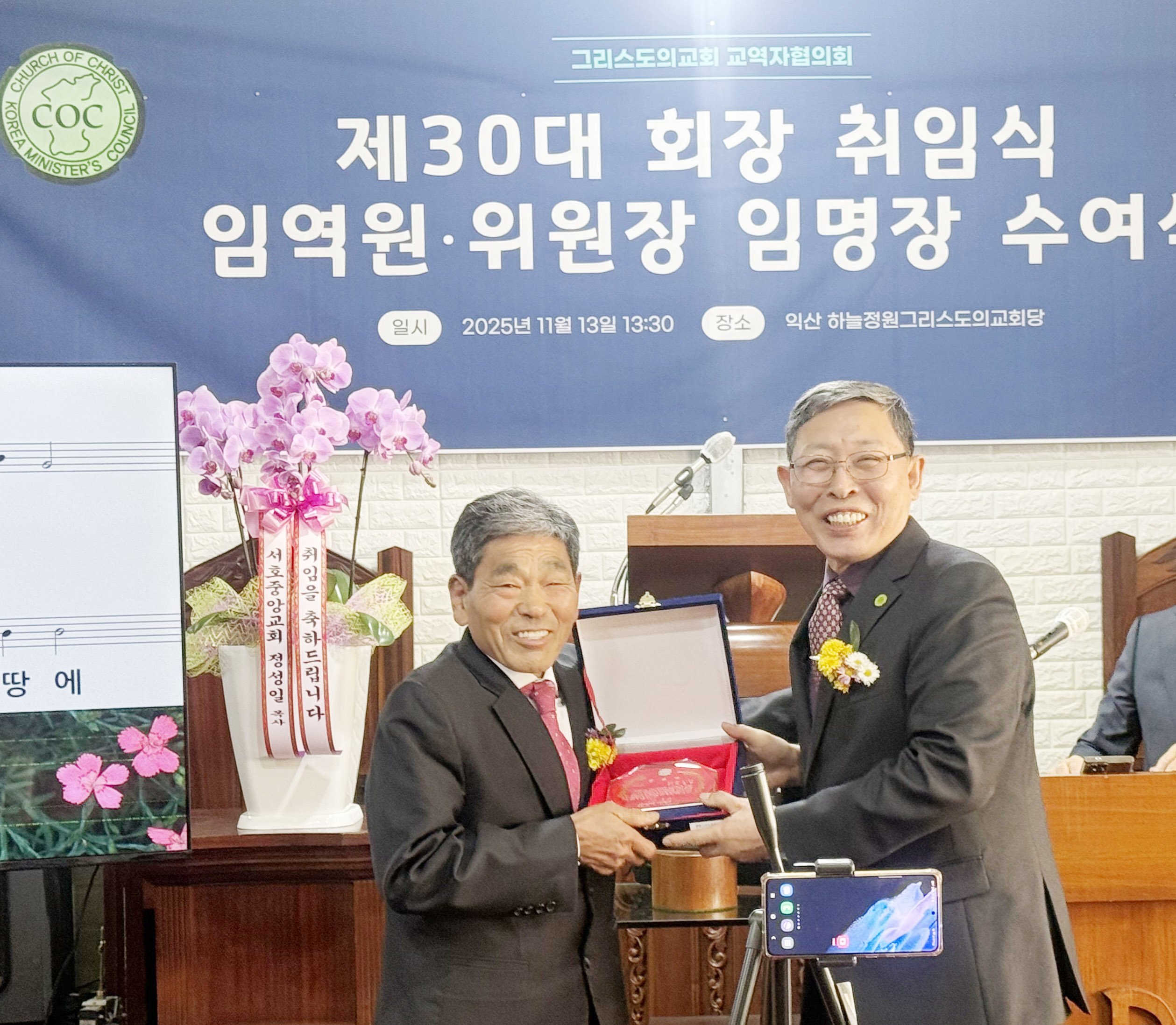 Á¤±â¿ø(¿ìÃø) ȸÀåÀÌ Á÷ÀüȸÀå ÃÖÁ¾¼ú( ÁÂÃø) ¸ñ»ç¿¡°Ô °¨»çÆÐ¸¦ Àü´ÞÇϰí ÀÖ´Ù.