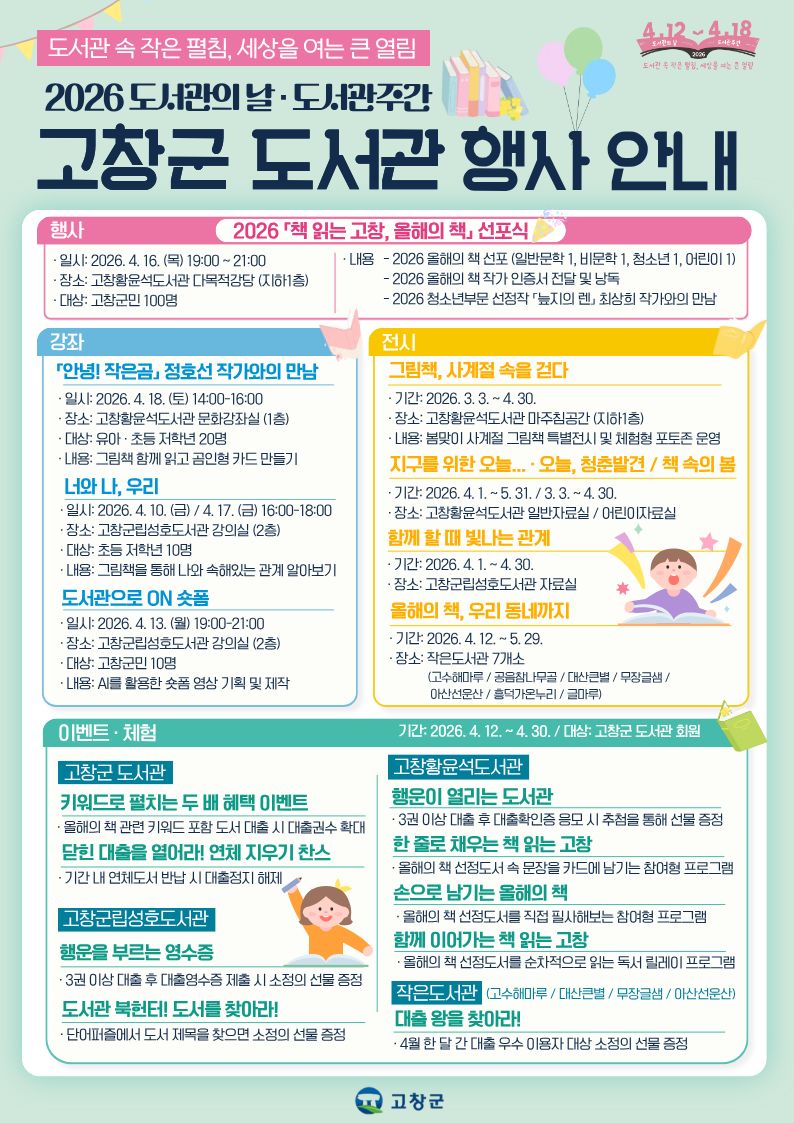 ¸ÕÀú, ¿À´Â 16ÀÏ °íâȲÀ±¼®µµ¼°ü¿¡¼ ¡®2026 Ã¥ Àд °íâ, ¿ÃÇØÀÇ Ã¥ ¼±Æ÷½Ä¡¯ÀÌ ¿¸°´Ù. ¿ÃÇØÀÇ Ã¥ ¼±Æ÷¿Í ÇÔ²² ºÐ¾ßº° ¼±Á¤ µµ¼ ³¶µ¶ÀÌ ÁøÇàµÇ¸ç, û¼Ò³â ºÎ¹® ¼±Á¤ÀÛ ¡®´ËÁöÀÇ ·»¡¯ÀÇ ÃÖ»óÈñ ÀÛ°¡¿ÍÀÇ ¸¸³²µµ ÁøÇàµÈ´Ù.